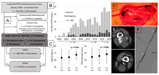 (A) Patient selection and final study cohort flow chart. (B) Annual increase in emergency and elective procedures and timeline for three consecutive cohorts. (C) Distribution of patient age and PAA diameter in three consecutive cohorts (median; interquartile range) (one-way ANOVA; p < 0.05 considered to be significant and highlighted in bold) (PAA: popliteal artery aneurysm; SSI: surgical-site infection; OPAR: open PAA repair; EPAR: endovascular PAA repair). (D) Intraoperative photograph of 45 mm diameter PAA through the Hunter canal (white dotted line) from the distal femoral artery to segment II of the popliteal artery (red vessel loops) (yellow vessel loops mark the saphenous nerve). (E) CT angiography (axial view) with giant partially thrombosed PAA (#) on the right leg (upper picture) with dilation of the popliteal vein (§) due to hindered outflow in comparison with a normal configuration on the contralateral leg (lower picture). (F) Intraoperative fluoroscopy after popliteo–popliteal venous graft interposition (asterisk: proximal/distal anastomosis) via puncture through the upper anastomosis with consecutive two-vessel tibial runoff (fibular + anterior tibial artery).