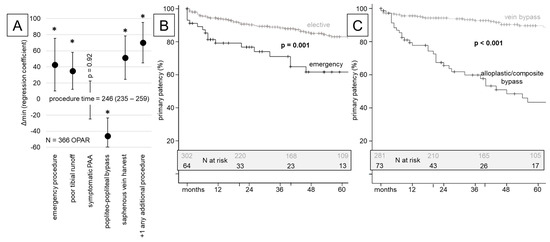 (A) Multivariate regression analysis of procedure time for OPAR procedures. The median procedure time was 246 (235–259) min. The regression coefficient displays the prolongation or reduction in the operation (values are given in Table S4; *: p < 0.05). (B,C) Kaplan–Meier estimate plots for the technical endpoint primary patency over 60 months stratified for elective vs. emergency revascularization (B) and vein vs. other material bypasses (C), respectively. Patient numbers at risk are displayed as an inlet (p < 0.05 considered to be significant and highlighted in bold).
