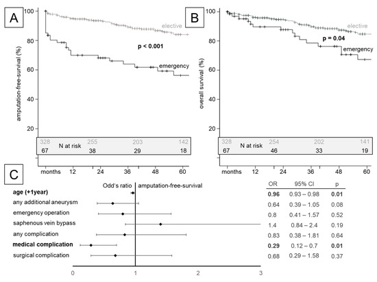 Kaplan–Meier estimate plots for the efficacy endpoint of amputation-free survival (A) and overall survival (B) stratified for elective vs. emergency repair, respectively. Patient numbers at risk are displayed as an inlet. (C) Multivariate risk analysis to reach the efficacy endpoint for amputation-free survival (OR: odds ratio; CI: 95% confidence interval; p < 0.05 considered to be significant and highlighted in bold; values are given in Table S6).
