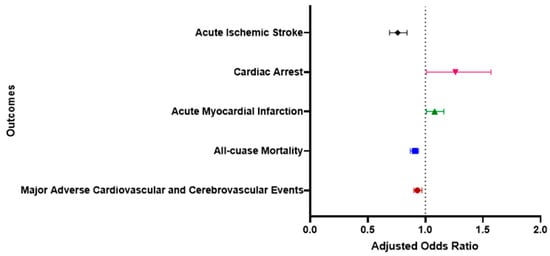 Upon adjusting for the above variables, there were lower odds of in-hospital MACCEs [adjusted odds ratio (AOR) = 0.93, 95% CI (0.90–0.97), p < 0.001], all-cause mortality [AOR = 0.91, 95% CI (0.87–0.94); p < 0.001], and AIS [AOR = 0.76, 95% CI (0.69–0.84); p < 0.001] in the MHO group. Conversely, the odds for AMI [AOR = 1.08, 95% CI (1.01–1.16); p < 0.001] and cardiac arrest [AOR = 1.26, 95% CI (1.01–1.57); p = 0.045] were higher in the MHO group (Figure 2).