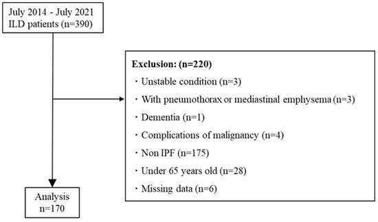 A total of 390 patients with ILD were recruited to the TRIP study between July 2014 and July 2021. Among them, 170 patients met the criteria for inclusion in this study (Figure 1).