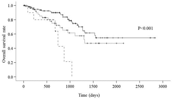A: Kaplan–Meier survival curves according to CONUT (controlling nutritional status) (—: normal group; - - - - - - -: mild group; – – –: moderate group) (p < 0.001). Survival curves were compared using log-rank statistics.