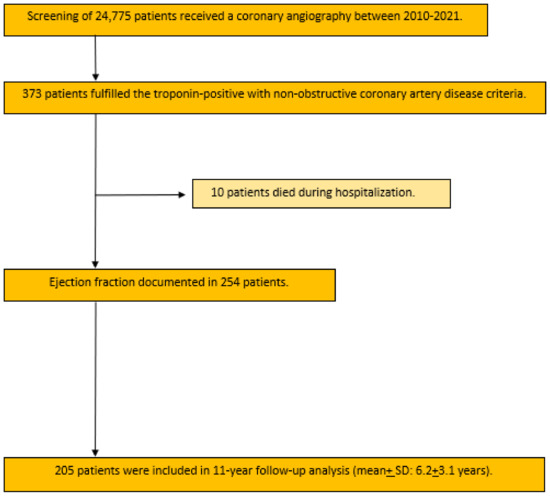 Of these cases, 254 patients fulfilled the required inclusion criteria and information about LVEF was available. Among them, 170 patients had LVEF ≥ 50%, 31 patients had LVEF 40–49%, and 53 patients had LVEF < 40%. A total of 10 patients died during hospitalization; 205 patients were included in the follow-up analysis. The follow-up time was 6.2 + 3.1 years (Figure 1).