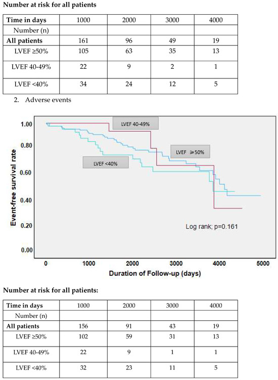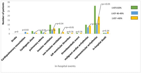 Duration of hospitalization was shorter in LVEF ≥ 50% 7 (6–9) days compared to LVEF 40–49% 8 (6–16) days and LVEF < 40% 12 (8–17) days; p < 0.001, which could be explained by the different in-hospital adverse event rate. Adverse in-hospital events were lowest in LVEF ≥ 50% (27.1%) compared to LVEF 40–49% (54.8%) and LVEF < 40% (55.8%); p < 0.001. Although in-hospital complications, e.g., left ventricular thrombus, thromboembolic events, pulmonary edema, cardiogenic shock, invasive ventilation, and stroke, presented similarly in all groups, LVEF 40–49% suffered more significantly from malignant arrhythmic events. The in-hospital all-cause mortality did not differ significantly between the groups (Table 3, Figure 2).