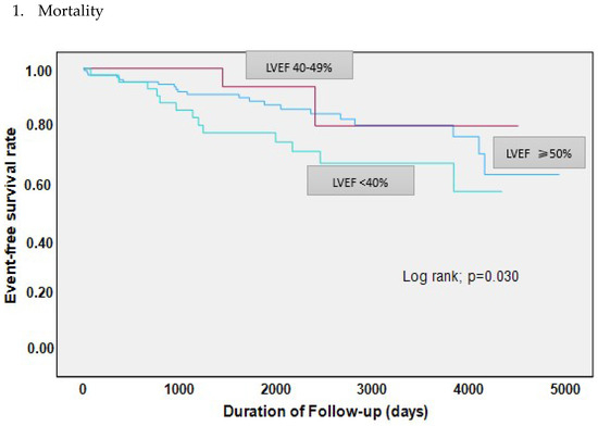 In the present study, angina pectoris was the main symptom at admission in the LVEF ≥ 50% group; nevertheless, dyspnea was more commonly reported in LVEF < 40% compared to other groups [26]. Tn-I and BNP levels were significantly higher in the LVEF < 40% group compared to other groups. Increased levels of Tn-l and BNP levels are consistent with declined LVEF and a sign of higher myocardial injury [27,28]. Additionally, these parameters are related to worsened disease progression and a higher mortality rate in myocardial infarction with obstructive coronary artery disease and non-obstructive coronary artery disease [29,30]. Of note, the rate of atrial fibrillation tended to be higher in the LVEF < 40% and LVEF 40–49% groups compared to the LVEF ≥ 50% group. This may highlight the role and association of atrial fibrillation in the present cohort. Atrial fibrillation is a common relevant predictor of the outcome of patients suffering from cardiovascular disease [31,32].
