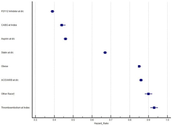 Forest plot of the hazard ratios (HRs) and 95% confidence intervals (CIs) for variables predictive of lower risk of MACE in this contemporary observational cohort; † compared to Caucasians. Abbreviations: ACEI: angiotensin-converting enzyme inhibitor, ARB: angiotensin receptor blocker, CABG: coronary artery bypass graft, d/c: discharge.