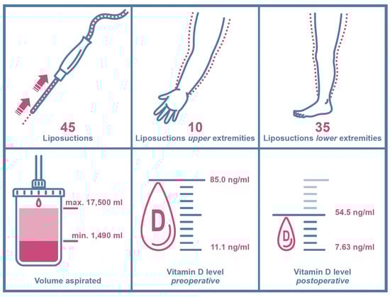 In this study we analyzed pre- and postoperative vitamin D serum levels in lipedema patients undergoing liposuction at the Clinical Department for Plastic, Aesthetic and Reconstructive Surgery at the University Hospital St. Poelten, between 1 January 2018 and 31 December 2022. The study was conducted as a retrospective single center study. Ethical approval was obtained from the local institutional review board at the Karl Landsteiner University of Health Sciences Krems (reference number: ECS 1041/2021). Analyzed factors included the patients’ age at surgery, BMI, volume of lipoaspiration, pre- and postoperative serum vitamin D levels, localization of treated area (upper and lower extremities) and liposuction sessions (one, two or three sessions).