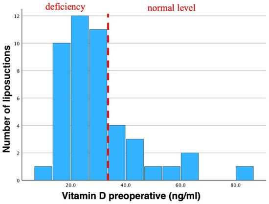 Histogram of preoperative vitamin D. Mean vitamin D levels were 30.1 ng/mL in total. Std. was 14.45 ng/mL (N = 46). Preoperative vitamin D insufficiency (according to the endocrine society) can be observed as most bars are shifted to the left. This vitamin D insufficiency is often seen in lipedema patients. Dotted line indicates the threshold of vitamin D deficiency to non-deficiency in preoperative patients.