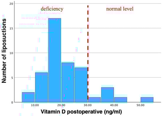 Histogram of postoperative vitamin D levels. Mean vitamin D was 21.91 ng/mL. Std. was 9.18 ng/mL (N = 46). A vitamin D insufficiency can clearly be seen in postoperative values as the bars are shifted to the left. Pre-existing vitamin D insufficiencies are further aggravated through liposuction. Dotted line indicates the threshold of vitamin D deficiency to non-deficiency in postoperative patients.