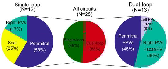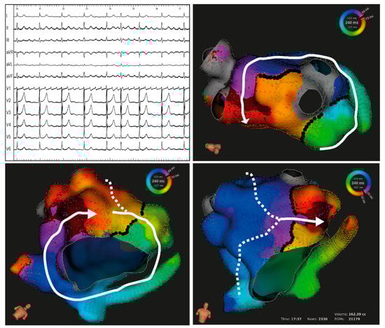 - Seiler, J.; Schmid, D.K.; Irtel, T.A.; Tanner, H.; Rotter, M.; Schwick, N.; Delacrétaz, E. Dual-loop circuits in postoperative atrial macro re-entrant tachycardias. Heart 2007, 93, 325–330. [Google Scholar] [CrossRef] [PubMed][Green Version]