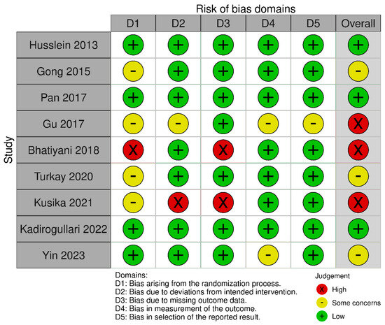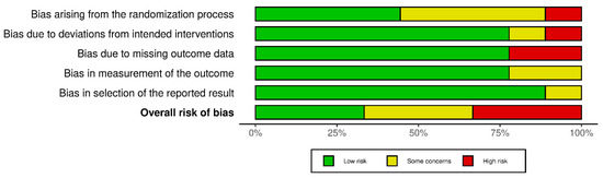 - Higgins, J.P.T.; Savović, J.; Page, M.J.; Elbers, R.G.; Sterne, J.A.C. Chapter 8: Assessing risk of bias in a randomized trial. Cochrane Handbook for Systematic Reviews of Interventions, version 6.4 (updated August 2023); Higgins, J.P.T., Thomas, J., Chandler, J., Cumpston, M., Li, T., Page, M.J., Welch, V.A., Eds.; Cochrane. 2023. Available online: www.training.cochrane.org/handbook (accessed on 11 March 2024).