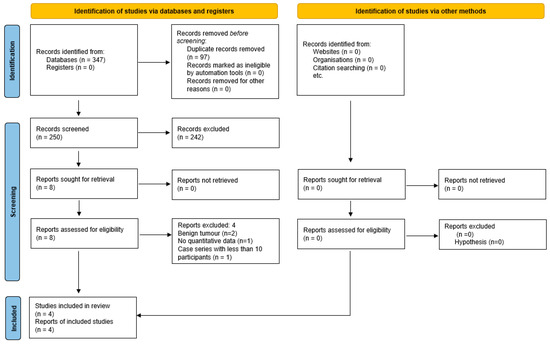 Following the previously described search procedures, a total of 347 records were identified. After the removal of 97 duplicate records, we excluded a further 242 on the basis of their title and/or abstracts. Subsequently, eight papers were investigated for eligibility and four further records were excluded (Table 3).