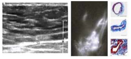 After the injections, lymphatic drainage was studied using an infrared camera system, the Photodynamic Eye (PDE), Hamamatsu Photonics, Hamamatsu, Japan. The number and quality of lymphatic collectors, lymphatic function, and dermal backflow patterns were analyzed, and the data were integrated with the ultrasonography results [20] (Figure 1 and Figure 2).