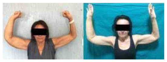 Patient affected by upper limb breast-cancer-related lymphedema. Preoperative and postoperative evaluation at 1 year. A volume reduction of 41% was measured.