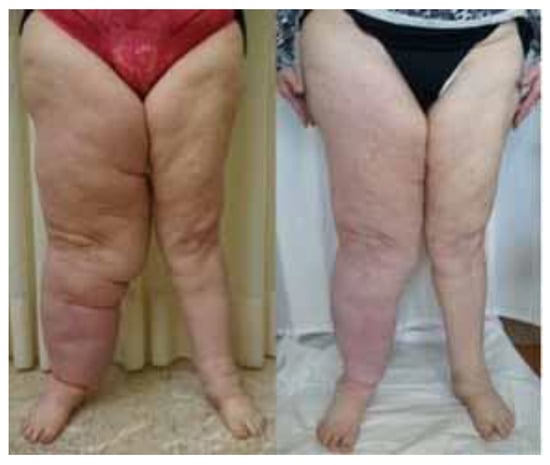 - Brazio, P.S.; Nguyen, D.H. Combined Liposuction and Physiologic Treatment Achieves Durable Limb Volume Normalization in Class II-III Lymphedema: A Treatment Algorithm to Optimize Outcomes. Ann. Plast. Surg. 2021, 86 (Suppl. S3), S384–S389. [Google Scholar] [CrossRef] [PubMed]