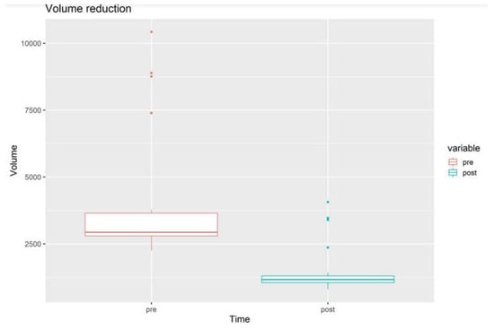 Statistical analysis of the volume measurements before and after surgery. Postoperative volume was significantly reduced. Average volume reduction was 37.9%.