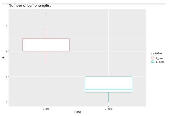 Statistical analysis of the lymphangitis rate before and after surgery. While before surgery an average of 4.6 lymphangitis episode was registered, after surgery lymphangitis reduced to 0.95 per year.