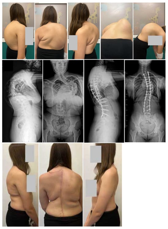The surgical intervention for patients in the G2 cohort was bifurcated into two stages. A refined version of the internal distraction techniques elucidated by Buchowski et al. [] and Skaggs et al. [], extensively expounded upon by Grabala and Helenius [], was implemented during the surgical intervention. In essence, during the initial procedure, akin to minimally invasive surgical strategies for the standard deployment of growing rods across the proximal thoracic and lower lumbar spinal levels, segmental screws were situated, accompanied by posterior column osteotomies, typically within the exposed upper and lower spinal regions. Subsequently, two titanium alloy rods (primarily with a 6.0 mm diameter) were subcutaneously positioned and interconnected to the segmental screws, facilitating synchronous initial correction under neuromonitoring (NM). Furthermore, the precise internal distraction of the deformed spine was achieved with the aid of NM. The definitive surgery was scheduled 2–6 weeks after the initial operation and encompassed posterior column osteotomies (PCOs) at the deformity apex, bilateral segmental pedicle screw placement, and ultimate correction utilizing two contoured 6.0 mm cobalt–chromium rods []. The curvature correction entailed a combination of techniques such as compression–distraction, rod cantilevering, and derotation. An example of a patient managed with lengthening instrumentation for the treatment of deformity (LITD) is presented in Figure 2.