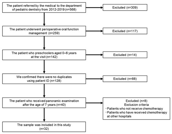 The study was performed in line with the STrengthening the Reporting of OBservational studies in Epidemiology (STROBE) statement [12]. This study was conducted in full adherence to the Declaration of Helsinki. The study protocol was approved by the Hiroshima University Epidemiology Research Ethics Committee (approval number: E2023-0211). Informed consent was obtained via opt-out on our hospital website, and patients who opted out were excluded. We focused on 568 patients who were referred by medical institutions to the Department of Pediatric Dentistry of Hiroshima University Hospital from 2012 to 2019. Using these 568 patients, the inclusion criteria were determined as follows: patients received perioperative oral function management; received chemotherapy before the age of 6 years; confirmed there were no duplicates using patient ID to avoid analyzing the same patient multiple times; and received panoramic examination after the age of 7 years, when the presence of teeth other than third molars could be confirmed. We also confirmed name, surname, and date of birth. In addition, the patients who had not received chemotherapy or who were receiving chemotherapy at another hospital were excluded.