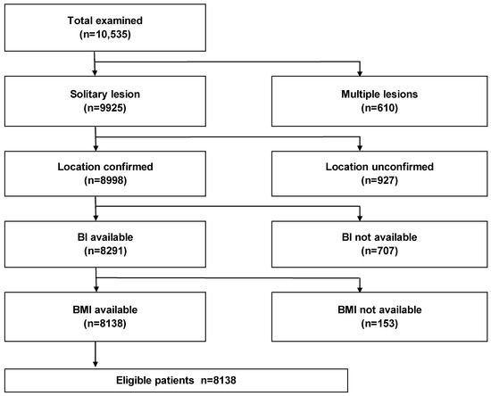 We included patients aged 9–95 years admitted to the hospital with a primary diagnosis of intracranial meningioma between 1 July 2010 and 31 March 2015. Diagnoses of meningioma and intracranial tumor removal procedure were evaluated based on ICD-10 codes (D320 and K169, respectively). In total, 10,535 patients with meningiomas were identified. We excluded multiple meningiomas, cases with unknown location, no BI assessments, and no detection of body mass index (BMI). Consequently, 8138 patients with meningiomas were retained (Figure 1).