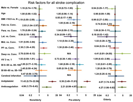 Next, Supplementary Table S1 demonstrates the results of the multivariate logistic regression analyses for all stroke complications in each age group. Sex, age, BMI, location, hospital volume, academic hospital, BI classification on admission, medical history, and use of statin drugs were all insignificant risk factors in the pre-elderly and elderly groups. Antiplatelet and anticoagulation drugs were repeatedly significant risk factors in all groups. Figure 2 shows the results of the multivariate logistic regression analysis for all stroke complications in all groups as forest plots.