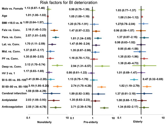 Forest plots of the risk factors for BI deterioration in the nonelderly, pre-elderly, and elderly. Abbreviations: BI, Barthel index; BMI, body mass index; Conv, convexity; HV, hospital volume; Lat, lateral; Mid, midline; N, normal; Para, parasagittal; PF, posterior fossa.