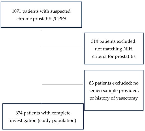 - Fu, W.; Zhou, Z.; Liu, S.; Li, Q.; Yao, J.; Li, W.; Yan, J. The effect of chronic prostatitis/chronic pelvic pain syndrome (CP/CPPS) on semen parameters in human males: A systematic review and meta-analysis. PLoS ONE 2014, 9, e94991. [Google Scholar] [CrossRef] [PubMed]