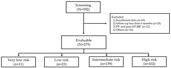 From January 2018 to June 2022, a total of 392 adult patients aged ≥ 18 years who were diagnosed with ET according to the World Health Organization (WHO) 2016 classification were screened (Figure 1) []. Patients were excluded if they had prefibrotic/early-stage primary myelofibrosis (MF), polycythemia vera, or post-ET MF, or had previously undergone therapy for ET other than HU or AG. According to the International Prognostic Score of thrombosis in World Health Organization-essential thrombocythemia (IPSET-thrombosis) model [,], risk stratification included four categories: very low risk (age ≤ 60 years, no previous thrombosis history, and JAK2 wild-type), low risk (age ≤ 60 years, no previous thrombosis history, and JAK2 mutated), intermediate risk (age > 60 years, no previous thrombosis history, and JAK2 wild-type), and high risk (age > 60 with mutated JAK2 or documented thrombosis history). Of the 275 evaluable patients, a total of 241 intermediate or high-risk patients (intermediate-risk, n = 139; high-risk, n = 102) were enrolled in this study. A retrospective review of patient’s medical records yielded the following clinical data: age at diagnosis, laboratory results including liver and renal function test, presence of JAK2 V617F mutation, history of prior thrombotic events, presence or absence of cardiovascular risk factors (hypertension, diabetes mellitus, and dyslipidemia), microvascular symptoms, daily dosage and duration of HU or AG treatment, treatment response, thrombotic or bleeding events during treatment, transformation to myelofibrosis or acute leukemia, the incidence of non-hematologic malignancies, and AEs. Allele-specific polymerase chain reaction (AS-PCR) was employed for the detection of the JAK2 V61F mutation in patients with ET, utilizing genomic DNA extracted from peripheral blood or bone marrow samples. The AS-PCR was carried out by using Forward wild-type primer (FC) 5′-ATC TAT AGT CAT GCT GAA AGT AGG AGA AAG-3′, Forward mutant primer (FM) 5′-AGC ATT TGG TTT TAA ATT ATG GAG TAT ATT-3′, and Reverse primer (FR) 5′-CTG AAT AGT CCT ACA GTG TTT TCA GTT TCA-3′ to cover the mutation point Val617Phe.