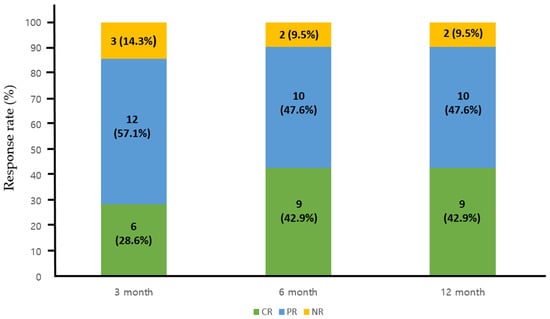 Response rate to the combination therapy at 3, 6, and 12 months post-treatment. CR, complete response; PR, partial response; NR, no response.