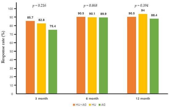 The treatment outcomes for each regimen are detailed in Table 2. In the combination group, the mean daily dose of HU and AG was 1142.5 mg/day (range, 500–2000) and 1.45 mg/day (range, 1.0–2.5), respectively, which were significantly lower than those administered in each monotherapy arm (p = 0.01 for HU and p < 0.01 for AG). Patients receiving AG monotherapy had a significantly shorter treatment duration compared to the other two groups (p = 0.022 for HU monotherapy). In terms of best overall treatment response at any time point in the combination group, we observed twelve CR patients (57.1%), eight PR patients (38.1%), and NR in one (4.8%). Specifically, for patients receiving combination therapy, the CR rate was 28.6%, 42.9%, and 42.9% at 3, 6, and 12 months after treatment, indicating a progressive improvement in objective response over the course of treatment (Figure 2). Overall response rate during the treatment period did not exhibit significant differences between the groups, although there was a trend towards a lower response rate in patients treated with AG alone at 3 months post-treatment (AG + HU, 18/21, 85.7% vs. AG alone, 57/69, 75.4%, p = 0.068, Figure 3). Within the combination group, only one patient experienced an arterial thrombotic event (cerebral infarction) after treatment. Thrombotic events occurred in nine patients (three arterial and six venous thrombosis) receiving HU monotherapy and in three patients (two arterial and one venous thromboses) receiving AG monotherapy, with no significant difference observed between the groups. During the respective courses of therapy, one patient experienced subdural hemorrhage in the HU monotherapy group, and two patients experienced bleeding events (pulmonary hemorrhage and small bowel bleeding) in the AG monotherapy group, while no bleeding events were reported in the combination therapy group (no statistical significance).