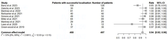 Forest plot of successful localisation rate in the pooled analysis [,,,,,,,,].