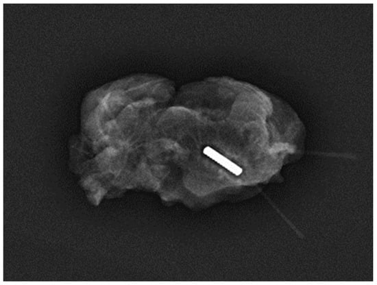 Magseed® technology, introduced into clinical practice in 2016, has undergone improvements to enhance user-friendliness and MRI compatibility, expanding its utility []. Initially utilised primarily for non-palpable breast lesions [], its acceptance for axillary applications has gradually increased. However, there remains limited literature on its efficacy in aiding TAD. Our analysis, encompassing 494 Magseed® TAD procedures, provides evidence of its performance since the publication of the first study by Greenwood et al. in 2019. The 100% successful deployment rate is facilitated by the small size of the seed (5 × 1 mm) and narrow bore of the introducer needle (18 gauge) [] (Figure 3).