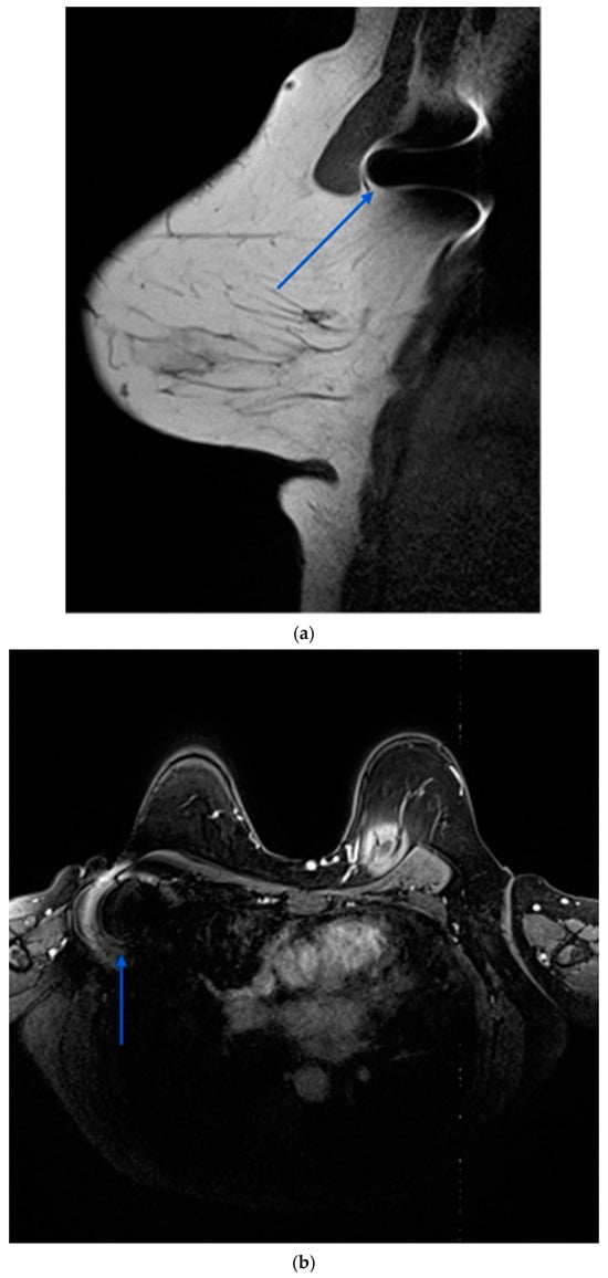 Contrast enhanced MRI after completion of NST demonstrating ferromagnetic artefact (blue arrows) generated by a magnetic seed previously placed in a right pathological axillary lymph node. (a): sagittal view; (b): axial view.