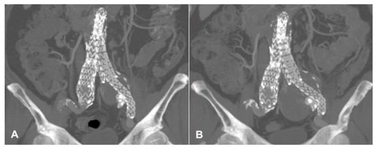 - Yasui, K.; Kanazawa, S.; Mimura, H.; Dendo, S.; Hiraki, Y.; Irie, H.; Sano, S. Recanalization 24 months after endovascular repair of a large internal iliac artery aneurysm with use of stent-graft. Acta Med. Okayama 2001, 55, 315–318. [Google Scholar] [CrossRef] [PubMed]