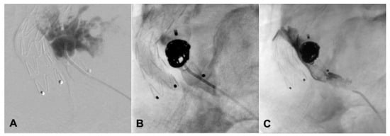 - Heye, S.; Vaninbroukx, J.; Daenens, K.; Houthoofd, S.; Maleux, G. Embolization of an Internal Iliac Artery Aneurysm after Image-Guided Direct Puncture. Cardiovasc. Interv. Radiol. 2012, 35, 807–814. [Google Scholar] [CrossRef] [PubMed]