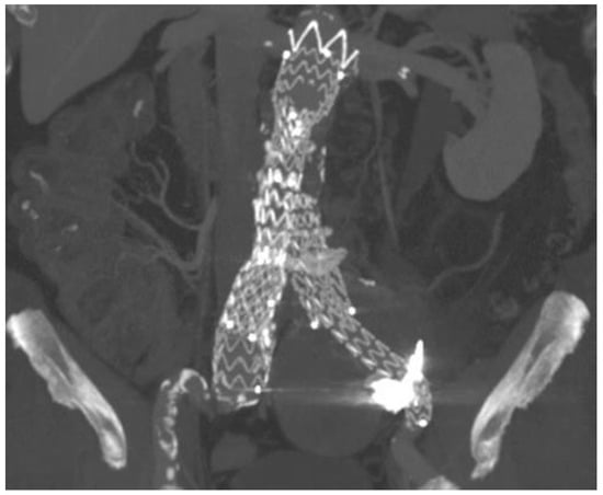 - Torsello, G.B.; Klenk, E.; Kasprzak, B.; Umscheid, T. Rupture of abdominal aortic aneurysm previously treated by endovascular stentgraft. J. Vasc. Surg. 1998, 28, 184–187. [Google Scholar] [CrossRef] [PubMed]