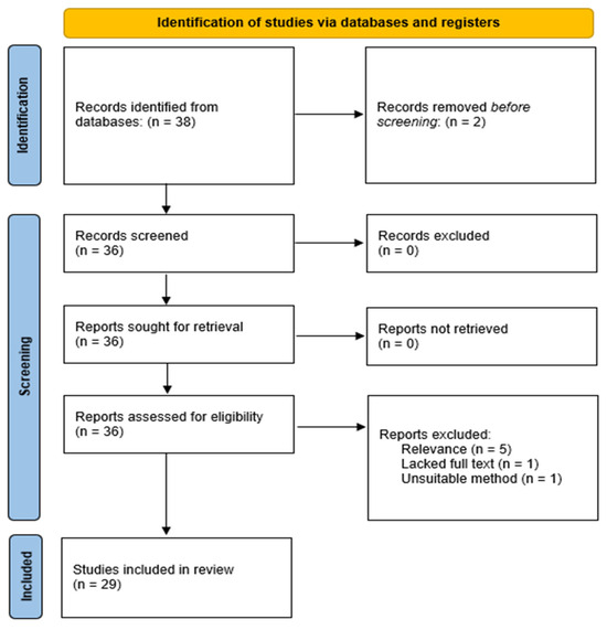 In this systematic review, 38 studies were initially identified, of which 2 were excluded due to duplication. The remaining 36 underwent rigorous screening against the inclusion criteria, excluding 7 articles for reasons such as lack of relevance to the specific application of shellac in orthodontics, absence of full-text availability, or incompatible study design. Consequently, 29 articles were included for comprehensive synthesis (Figure 1). These encompassed a variety of study designs, including cross-sectional, experimental, observational, one safety data sheet (Ettlingen, DE), and systematic reviews (Table 1). The investigations primarily assessed shellac’s biocompatibility, mechanical properties, and role as a sustainable material in orthodontics.