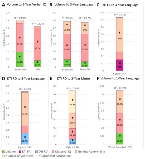 Early infant (overall period) multi-modal imaging trajectories and non-imaging factors’ contribution to variability in early childhood (A–E) and infant (F) outcomes. Reduced early infant (overall period) volume trajectories predicted poor language outcome across all three neurodevelopmental outcome periods (5-year, 3-year, and 1-year outcomes). Altered WM microstructural early infant (overall period) trajectories in SLF predicted poorer performance on a measure of language and ILF predicted poor motor performance at the 3-year assessment. Macrostructure (volume) trajectories in this period predicted 1-year (up to 21% of variability) and early childhood (up to 32% of variability) performance variability in language/verbal outcomes. The only significant contribution of cardiac lesion type (number of ventricles) was to 3-year motor outcomes. As such, early infant neuroimaging trajectory variables showed remarkable consistency in the degree of ND outcome variance explained across 1-year, 3-year, 5-year time points. Genetic abnormality’s contribution to outcome relatively decreased from 3-year to 5-year time points. In contrast, maternal IQ contributed to the outcomes, and the contribution to variability clearly showed a marked cumulative increase over time from the 1-year assessment (37%) to early childhood (up to 81%).