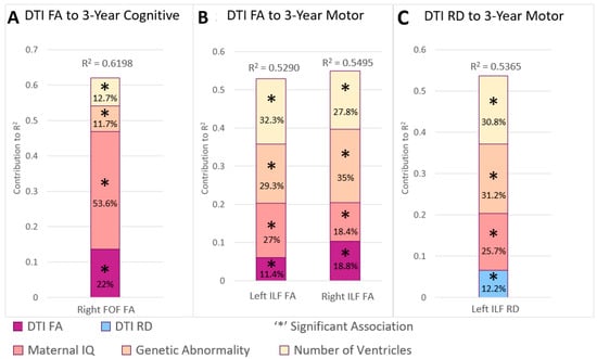 Reduced trajectory of brainstem (p = 0.0134; FC = 16.3%) and DGM (p = 0.0258; FC = 11.8%) volume predicted poor 3-year language performance in the final multi-variable model. In these analyses, lower maternal IQ (p < 0.0001; FC up to 62.1%) and presence of genetic abnormality (p = 0.002. FC up to 26.8%) also predicted poor language outcome. Additionally, reduced FA trajectory (p = 0.0256; FC = 21%) and increased RD trajectory (p = 0.0284; FC = 21.4%) of the SLF-R predicted poor 3-year language performance in the final multi-variable model. In these analyses, presence of genetic abnormality predicted poor language (p = 0.0011; FC up to 64%) performance as well. Besides language, increased RD trajectory (p = 0.0375; FC up to 9.7%) of the ILF-L predicted poor 3-year motor performance, which was also associated with lower maternal IQ (p = 0.0042; FC = 19.9%), presence of genetic abnormalities (p = 0.0009; FC = 28.6%), and single ventricle status (p = 0.0001; FC = 41.88%).