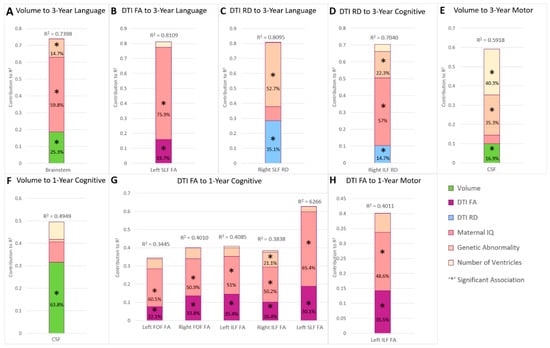 Perioperative period multi-modal imaging trajectories and non-imaging factors’ contribution to variability in early childhood (3-year) (A–E) and infant (1-year) (F–H) outcomes. The perioperative period imaging trajectories did not predict 5-year outcomes. Macrostructural trajectories (volume) contributed up to 64% in cognitive outcomes (CSF volume increase in (F)) at 1 year, as well as 17% of motor (CSF in (E)) and 25% of language variability (brainstem volume decrease in (A)) at 3 years. Microstructural FA trajectories accounted for up to 30% of cognitive (G) and 36% of motor (H) variability at 1 year and 20% of language (B) variability at 3 years. Microstructure RD trajectories contributed up to 15% of cognitive (D) and 35% of language (C) outcomes at 3 years. As such, perioperative neuroimaging trajectory variables showed remarkable consistency in degree of neurodevelopmental outcome variance explained across 1-year and 3-year time points, with the exception of increased CSF. Genetic abnormality’s contributions to cognitive outcome variability across the microstructure trajectory models were relatively consistent from 1-year to 3-year time points (21% to 22%), with the exception of language outcomes at 3 years. In contrast, maternal IQ’s contribution to outcome variability clearly showed a cumulative increase over time from 1 year to 3 years.