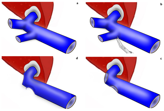 When a narrowed remnant portal vein segment is detected following closure of the right portal vein stump (Figure 1b–d), vascular clamps are placed both proximal and distal to the narrowed portal vein segment. Then, the sutures in the narrowed portal vein segment were removed. In type C anomalous portal venous branching cases, the sutures in both portal venous stumps leading to the right lobe were removed (Figure 2a). The venous bridge between both lumens was cut (Figure 2b,c) and turned into one lumen (Figure 2d,e). When viewed from the front and right sides, the venous opening generally appears as a longitudinal oval shape along the portal vein axis. Two corner sutures are placed 0.5 cm inferior of the upper pole of this oval structure (Figure 3a). The oval shape has now turned into a rectangular shape. The sutures used are 7/0 or 8/0 polypropylene. After checking endothelial integrity, a cryopreserved patchy venous graft was cut to the appropriate size on the back-table. At this stage, we usually cut the venous patch in accordance with the upper corners and start suturing the parts between the corner sutures at the most difficult point. When approaching the inferior poles, the venous patch is trimmed again to suit the portal venous opening. All-round suturing of the venous patch is completed (Figure 3b). It is confirmed that the venous patch applied to the portal venous elbow by removing portal venous clamps widens the stenosis satisfactorily (Figure 4a,b). After this stage, one more check is made with intraoperative Doppler ultrasonography.