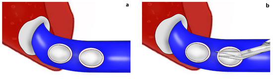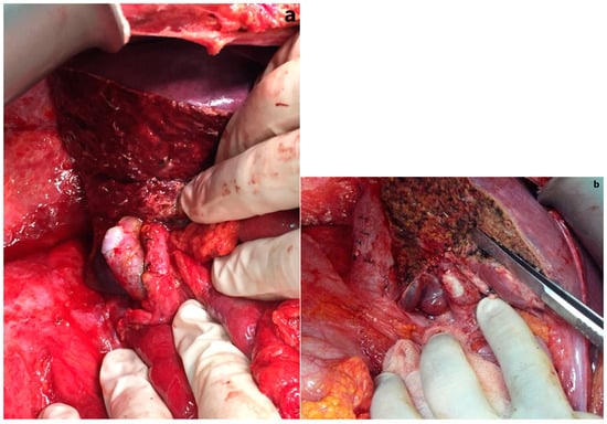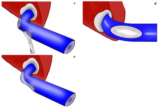While biliary complications are considered the most common after living donor hepatectomy [15], portal vein complications are rare, occurring in 0.1–3.8% of patients [16,17,18]. Although portal vein complications after living donor hepatectomy are rare, it should be considered that these complications are associated with significant morbidity and even mortality in patients [19]. Narrowing of the remnant portal vein at the take-off point of the right portal vein after right lobe living donor hepatectomy is a rare, but encountered, complication. The anatomy of the portal bifurcation is such that the left branch takes off at a sharp angle, whereas the course of the right branch is almost in line with the main portal trunk. The donor surgeon’s effort to remove a long right portal vein with a right lobe graft by encroaching on the borders of the main portal vein will inevitably cause stenosis and subsequent thrombus in the portal vein. Especially in the presence of anomalous portal venous branching in the right lobe (Figure 1a), the donor surgeon’s effort to remove the right portal vein as a single lumen is the most common cause of portal vein thrombosis after living donor hepatectomy [20,21,22]. In other words, at the immediate post-operative period, narrowing of the remnant portal vein may precipitate portal vein thrombosis, and this may become a life-threatening complication by causing portal hypertension, mesenteric congestion, and sepsis, which increase postoperative morbidity and mortality [17,21]. Long-term stenosis is associated with portal hypertension and its complications, which may be a significant source of morbidity for some donors after right lobe living donor hepatectomy [12,19,20,23,24].