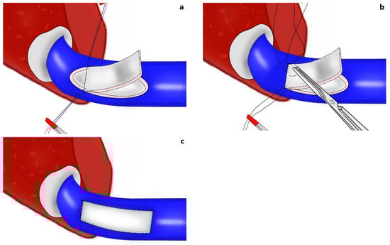 Reconstruction of narrowed portal vein by venous patch: (a) two corner sutures are placed 0.5 cm inferior of the upper pole of the oval opening to turn into a rectangular shape; (b,c) all-round suturing of the venous patch is completed.