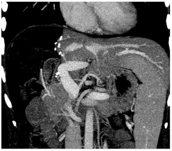 The coronal reformatted computed tomography imaging shows that the portal vein reconstructed with the elbow patch technique is patent.