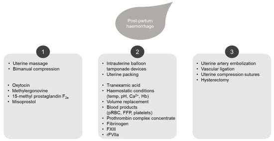 PPH is commonly managed using a multistep approach that combines pharmacological and mechanical measures (Figure 1) [4,5]. First-line treatment options include uterotonics. If uterotonics fail to control the bleeding, volume replacement therapy and various hemostatic agents, blood products and non-invasive surgical procedures such as balloon or hemostatic dressing tamponades are applied as second-line treatment. Additional treatment is needed if bleeding persists in order to prevent hemorrhagic shock. This includes invasive procedures such as uterine compression sutures or arterial ligation, arterial embolization and, ultimately, hysterectomy as a last resort [4].