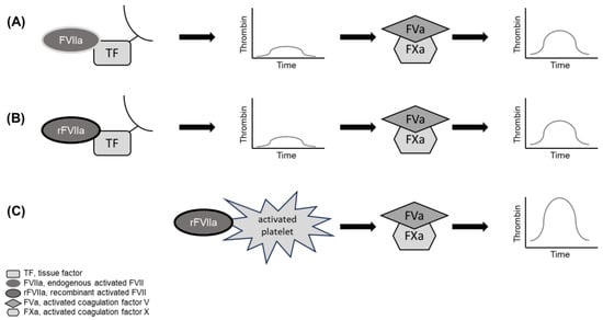 Hypothesized rFVIIa mechanism of action. Endogenous FVIIa forms a complex with tissue factor to initiate hemostasis (A). Recombinant FVIIa administered at pharmacological doses is over 200 times the level of endogenous FVIIa and binds to tissue factor (B) and with low affinity to activated platelets (C). On the activated platelet surface, rFVIIa induces a TF-independent increase in thrombin generation, bypassing the intrinsic coagulation pathway. In parallel, a TF-dependent pathway also promotes thrombin generation. FVa, activated factor V; FVIIa, activated factor VII; FXa, activated factor X; rFVIIa, recombinant activated factor VII; TF, tissue factor.
