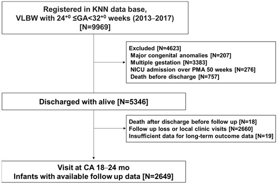 A total of 9969 VLBW infants were registered in the KNN registry during the study period. Of these, 4623 infants were excluded for the following reasons: congenital anomalies (n = 207), multiple gestations (n = 3383), not discharged until postmenstrual age 50 weeks (n = 276), and death before discharge (n = 757). Among the 5346 infants, 2697 were excluded after discharge due to post-discharge death (n = 18), loss to follow-up (n = 2660), and insufficient follow-up data (n = 19). Finally, 2649 infants were included in the analyses, and their information was available for the CA of 18–24 months visit (Figure 1).