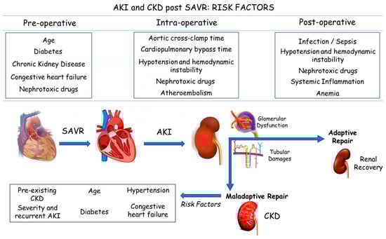 It is known that high pre-operative creatinine levels, end-stage renal disease, comorbidities such as chronic heart failure or diabetes, the long duration of cardiac surgery, and an increased post-operative lactate level can be identified as classical predictors of peri-operative AKI in patients undergoing cardiac surgery [,] (Figure 1).