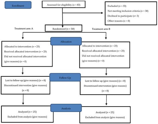 The sample size was determined through power analysis using the GPower 3.0.10 software. based on the 13-point difference in the Anterior Knee Pain Score (AKPS), with a standard deviation of 12.8 and 0.80 power with a level of significance a = 0.05 with two-tailed t-test, and an estimated drop out of 15% []. A minimum sample size of 23 subjects per group was indicated.