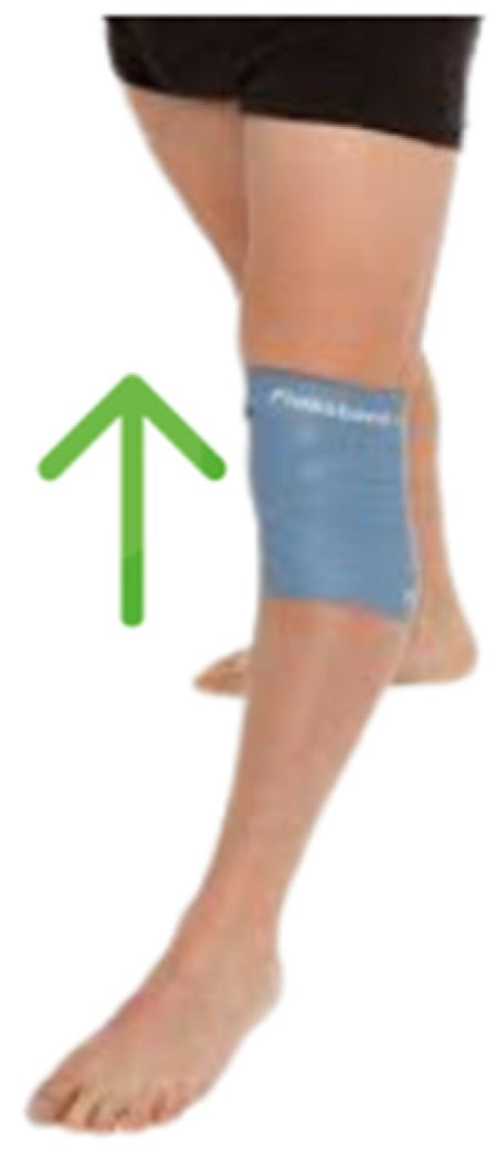 In addition to the aforementioned protocol, participants in the flossing band group receive a treatment that includes the application of a flossing band. The flossing band, made from a thick elastic latex, is 1.3 mm thick, 50 mm wide, and 2 m long, with a strength level of 3 (COMPRE Floss, Sanctband, Hamburg, Germany). Before each physiotherapy session, the flossing band is applied around the knee joint to provide moderate compression. The application of flossing to the knee commences with a preliminary evaluation of the joint range of motion and pain perception. The bandaging technique was meticulously applied by the principal investigator, who was also responsible for its removal. The procedure was initiated approximately 2–3 cm below the inferior pole of the patella, with the band being placed in an upward direction around the thigh. Each subsequent layer of the band overlapped the previous by about 25 mm. During this process, the patient was positioned in an upright stance without fully locking the knee. The final portion of the band was securely fastened below the preceding wrap. The band is wrapped around the knee, starting with an approximate tension of 50% for the first wrap and escalating to a tension of 60–80% in subsequent wraps. It is essential to overlap the band with each wrap, moving from a distal to the proximal direction (bottom to top), which aids in enhancing drainage. (Figure 2). Upon application of the bandage, the participants executed the exercises as specified in the preceding protocol.